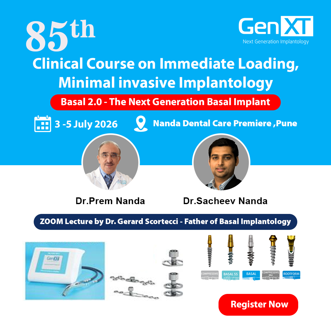 Step into the future of implant dentistry with the 85th Clinical Course by GenXT, designed for clinicians who want to master Basal Implantology & Immediate Loading protocols with real-world application.