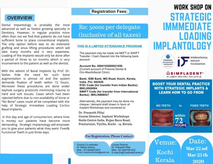 Course Director. Implant Workshops Smile Centre India. Kujan Bava Road, Ponnurunni, Vytilla, Kochi- 19 Kerala
